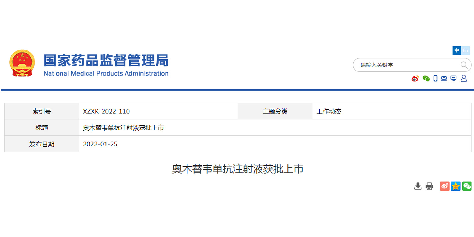 国家药品监督管理局网站1月25日消息,近日,国家药品监督管理局通过优先审评审批程序批准华北制药集团新药研究开发有限责任公司申报的奥木替韦单抗注射液(英文名: Ormutivimab Injection)上市,该药品为我国自主研发的重组人源抗狂犬病毒单抗注射液,用于成人狂犬病毒暴露者的被动免疫。