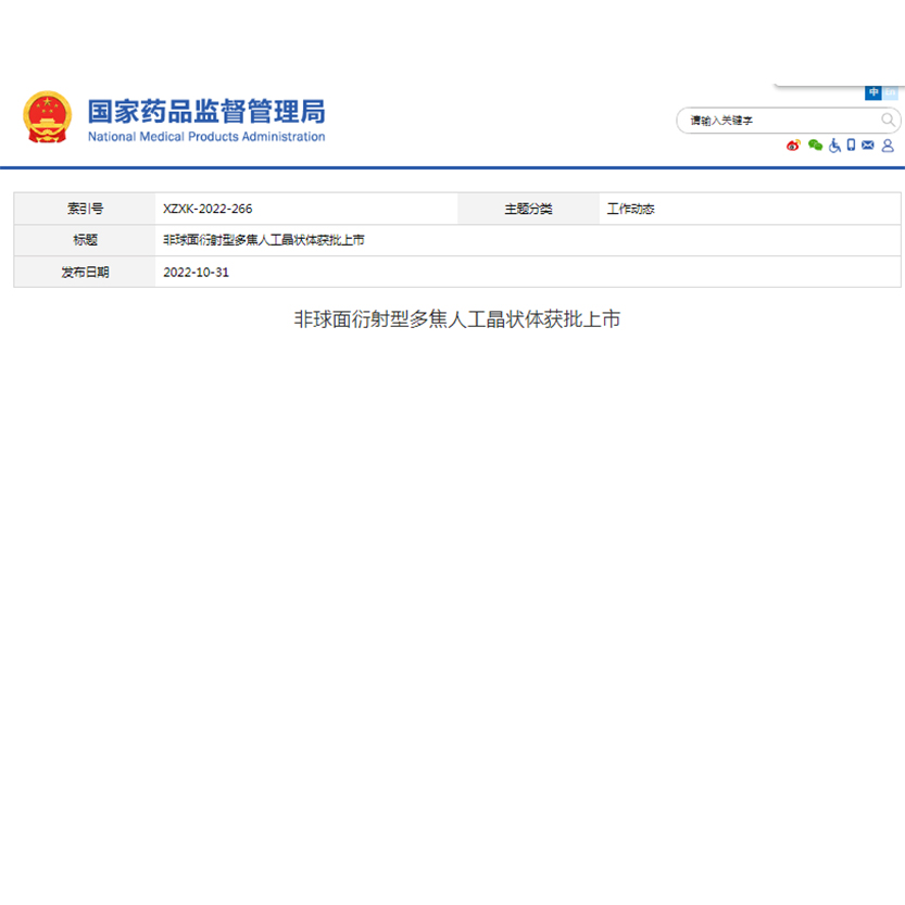 近日,国家药品监督管理局经审查,批准了爱博诺德(北京)医疗科技股份有限公司生产的创新产品“非球面衍射型多焦人工晶状体”注册。