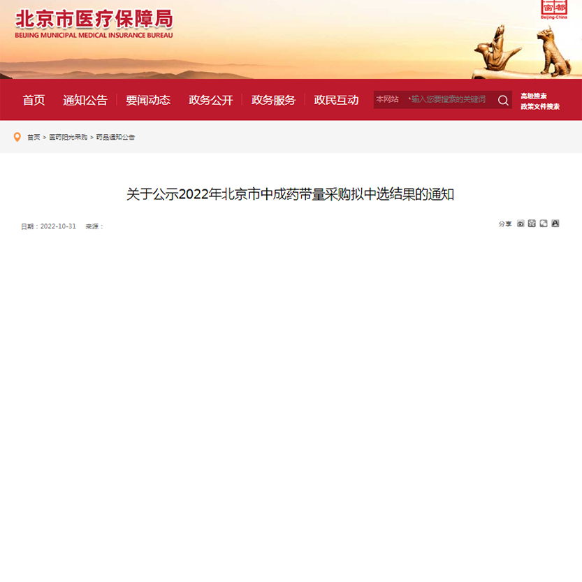 10月31日,北京市医保局发布了2022年北京市中成药带量采购拟中选结果的通知。通知内容中显示: 根据2022年北京市中成药带量采购工作安排,现将拟中选结果予以公示 , 公示时间2022年11月1日-11月3日。