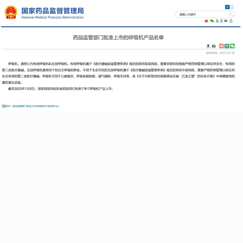 据国家药监局官网公布,截至1月5日,国家药监局和各省药监局已批准176个呼吸机产品上市