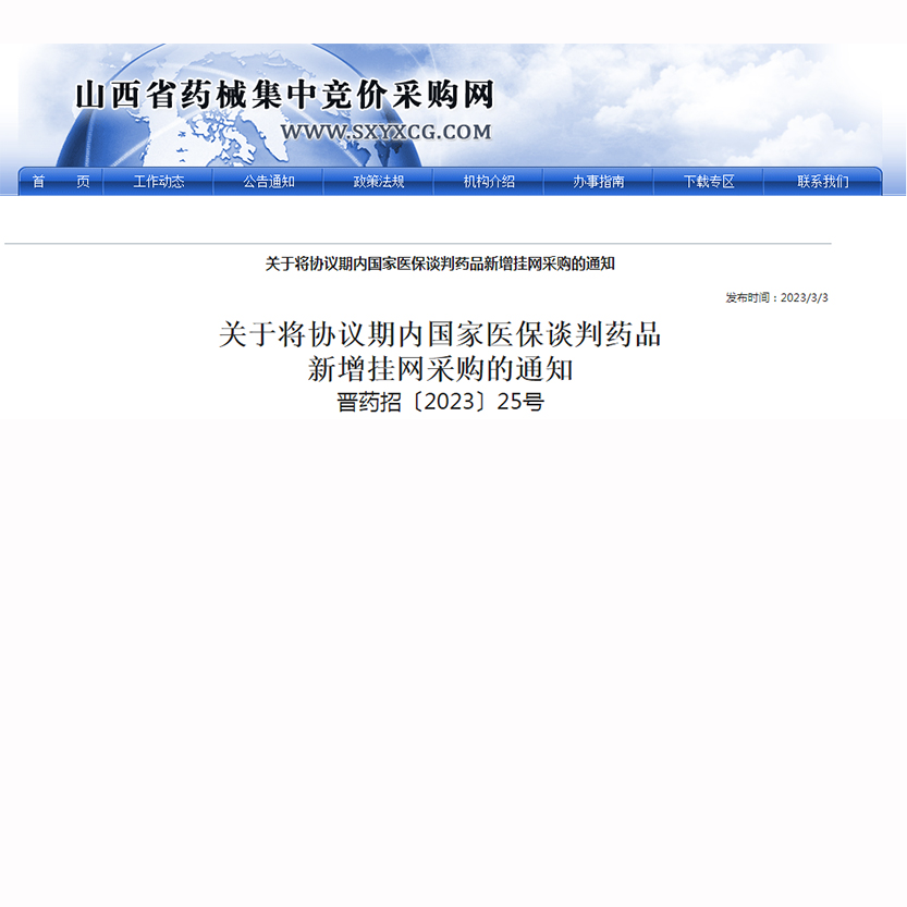 依据企业申请,根据《关于<国家基本医疗保险、工伤保险和生育保险药品目录(2022年)>谈判品种完善产品信息的通知》(晋药招〔2023〕16号)要求,我中心已将协议期内国家医保谈判、竞价药品新增挂网纳入我省阳光采购平台药品目录,供医疗机构采购。