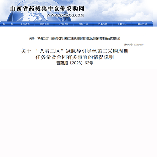 根据《山西省医疗保障局关于落实“八省二区”冠脉导引导丝和河南等十二省联盟骨科创伤类医用耗材集中带量采购中选结果的通知》(晋医保发〔2021〕24号)工作要求,“八省二区”冠脉导引导丝自2022年1月1日起执行中选结果,采购周期为2年。八省二区”冠脉导引导丝第二采购周期执行时间为2023年1月1日至2023年12月31日。