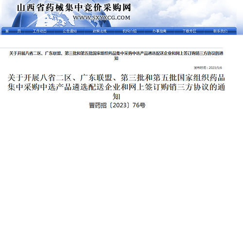 根据山西省医疗保障局《山西省医疗保障局关于做好协议期满集采药品归并接续工作的通知》(晋医保函〔2023〕7号)要求,现就我省全面落实八省二区、广东联盟、第三批和第五批国家组织药品集中采购中选产品遴选配送企业和网上签订购销三方协议有关事项通知如下: