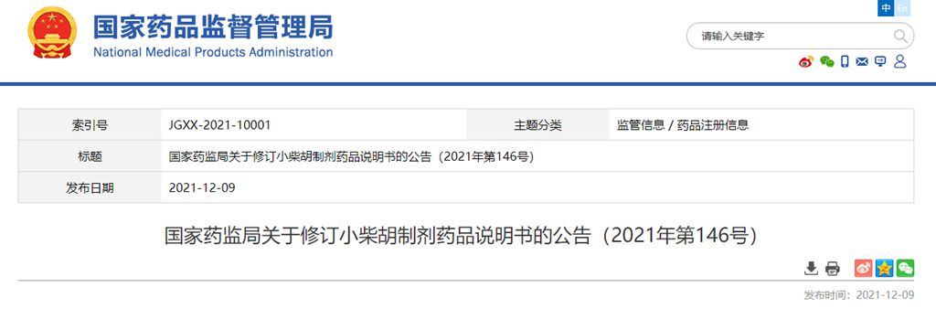 国家药监局关于修订小柴胡制剂药品说明书的公告(2021年第146号)